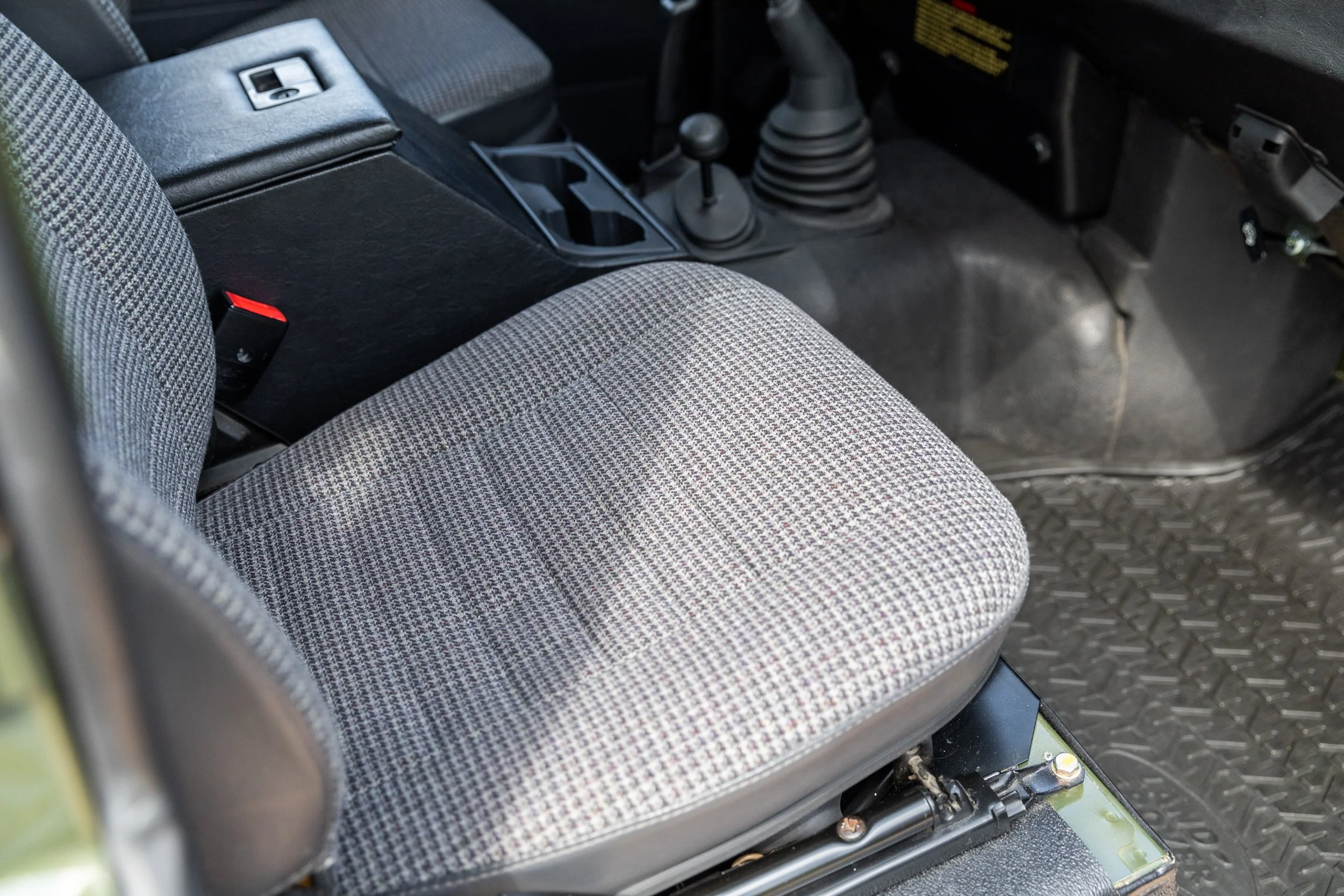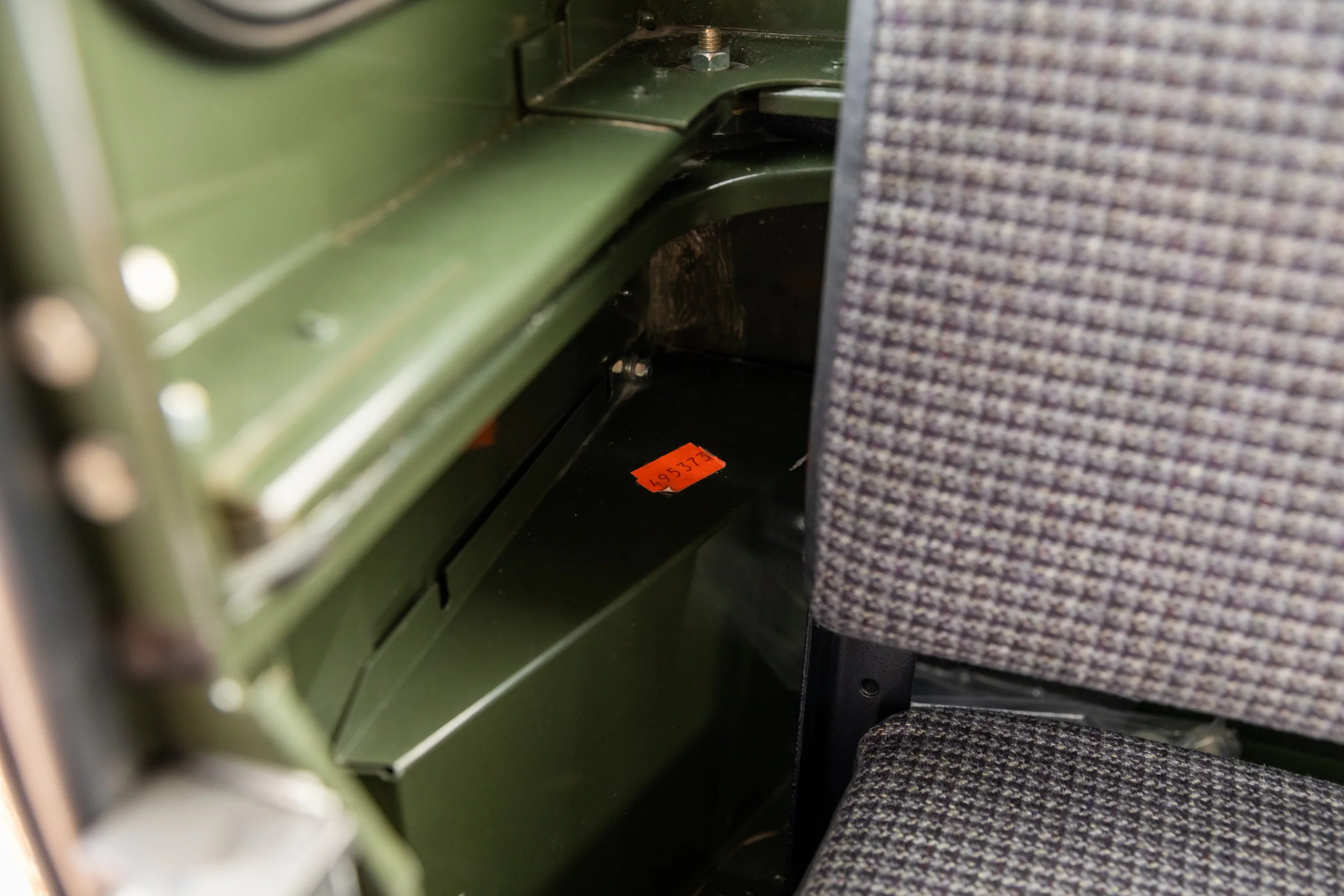 The interior is simply remarkable, it’s in completely original condition with little to no wear on the Grey Cloth seats and benches. It has had genuine factory over-mats fitted from new on top of the original floor mats, and lifting both of these reveals the factory stickers still applied on the floors. Unsurprisingly the footwells, a common problem area, are in immaculate condition with all the original bolts untouched. The original owners said that the rear rarely had people in it, and the rubber mat is still in great condition. The interior has simply been deep cleaned and tidied, a testament to the how it’s been looked after. The headlining was starting to sag, as they all seem to do on Defenders this age, so we decided to reupholster in it in premium cloth.